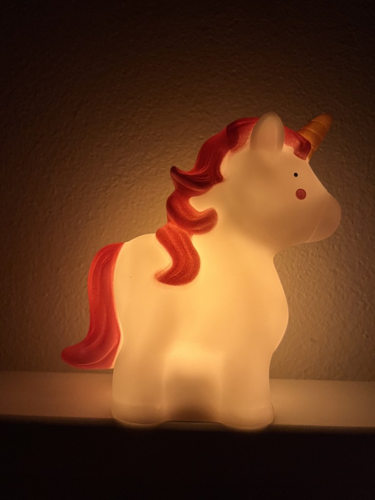Het unicorn lampje past gemakkelijk op ieder nachtkastje met afmetingen van slechts 10 cm breed en 11 cm hoog en de sterrenslinger is eenvoudig op te hangen. Hier is hij met plakband bevestigd aan het bedrand waardoor het naar bed gaan een feestje is geworden!