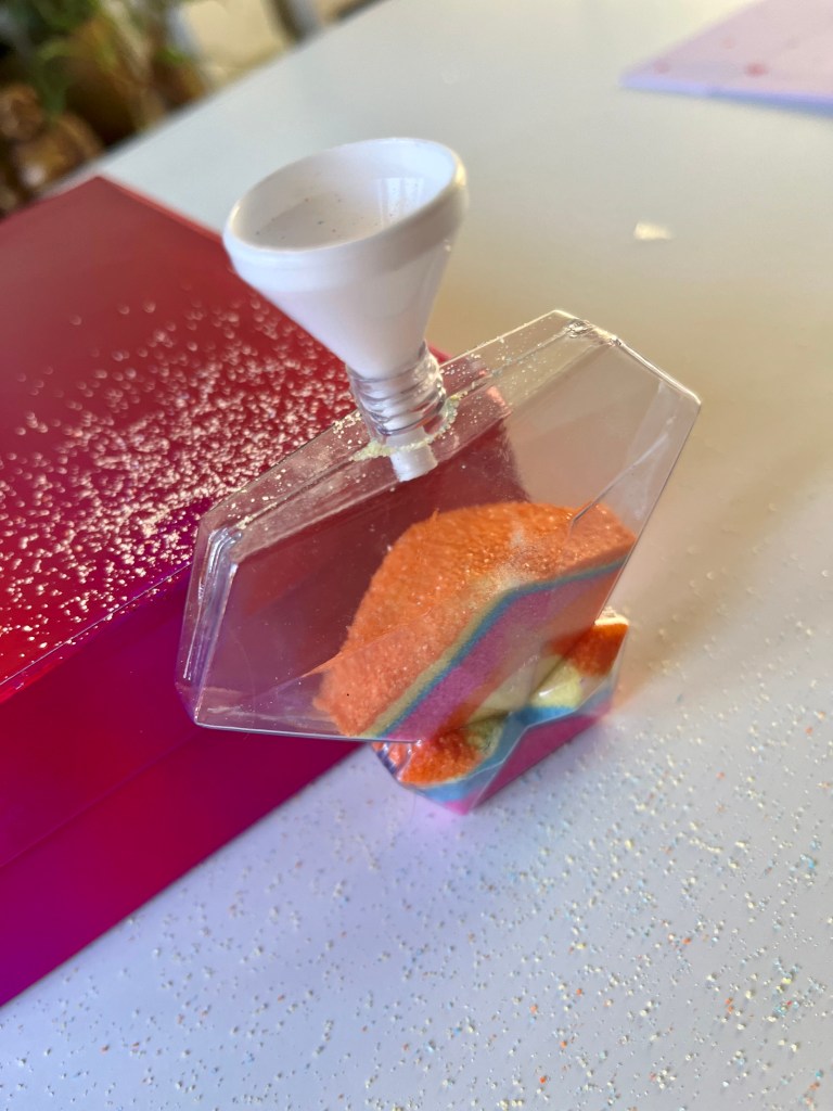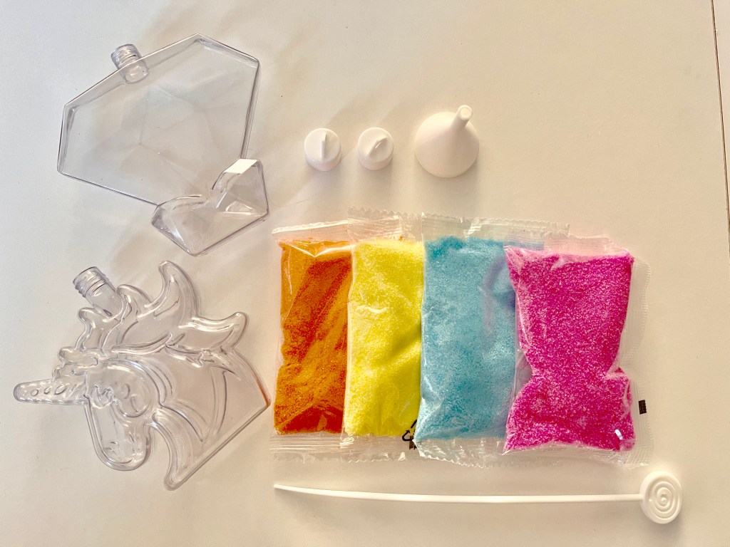 De koffer bevat ook magisch gekleurd zand en speciale vormpjes. Door het zand in de vormpjes te strooien en te schudden, ontstaan er prachtige kunstwerken. Experimenteer met verschillende kleuren en creëer je eigen unieke kunstwerken. Het is net alsof je een klein kunstenaar bent!