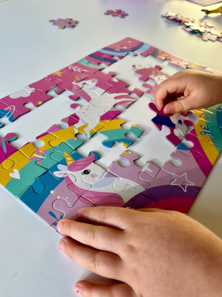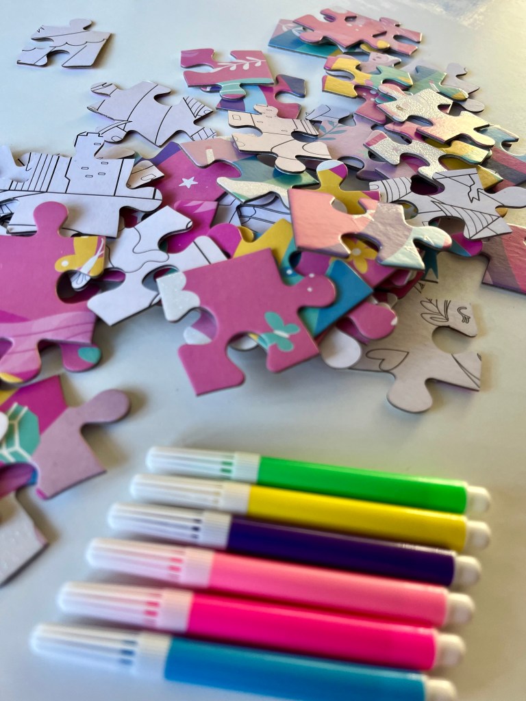 De koffer bevat een unieke puzzel met een verrassende twist. Aan de ene kant zie je een prachtige afbeelding van een eenhoorn, die je kind kan leggen. Maar daar houdt het plezier niet op! Draai de puzzel om en je hebt een blanco canvas om in te kleuren. Met de meegeleverde stiften kan je kind de eenhoorn helemaal naar eigen smaak versieren.